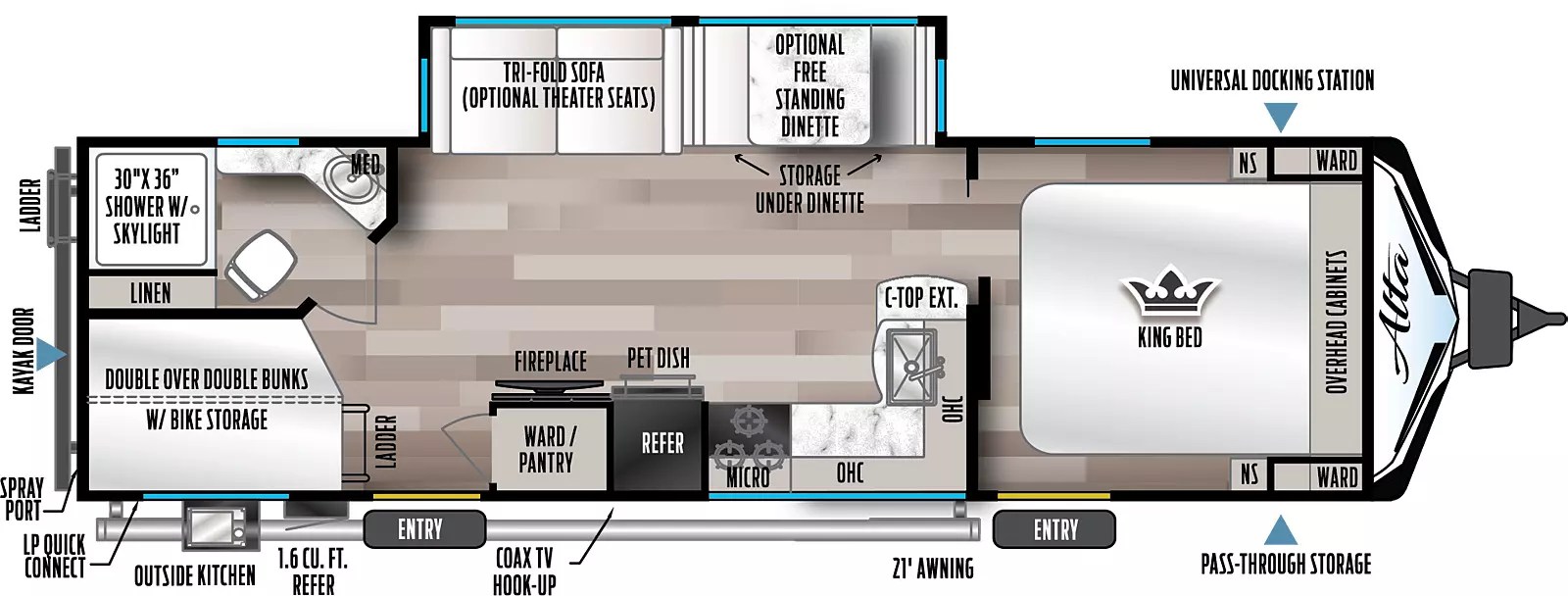 An on-demand water heater, 4G LTE/Wi-Fi prepped booster antenna, and a 40-inch smart TV are standard, as is an integrated sound bar and an external speaker system. The trailer has a 200-watt solar panel on the roof that feeds power to an onboard electrical system. The RV’s over sized slide-out contains an couch/tri-fold sleeper sofa and a free-standing dinette and pantry with extra storage underneath.